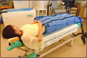 空気圧によって腰部から下肢にかけての マッサージをする治療器です。 足先から太ももまでのマッサージができ、血液の流れの 促進・神経伝達の促進・ 太もも、ふくらはぎ、足首などの むくみにも効果的です。 最近では、エステなど、痩身の施術などにも数多く使われています。